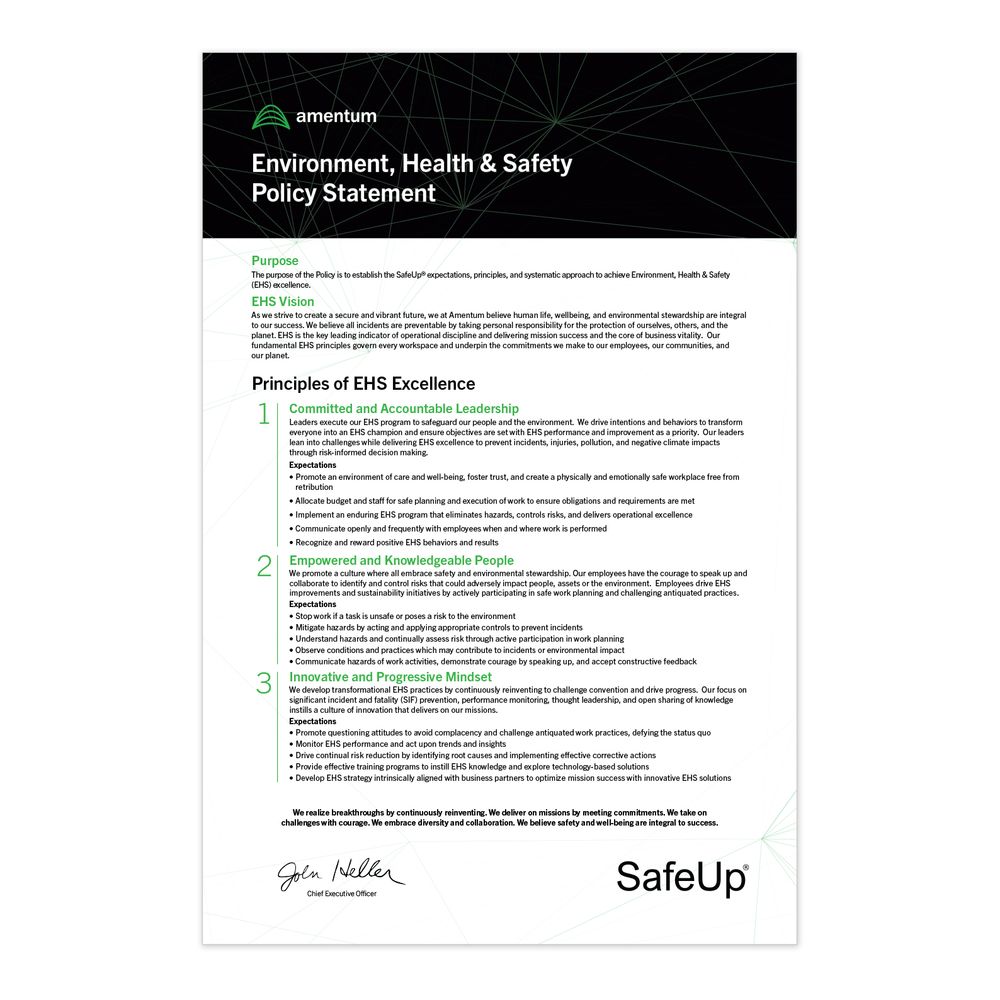 This product option is for the EHS Policy Poster with Logo includes with the official amentum branding. Size: 24 x 36.